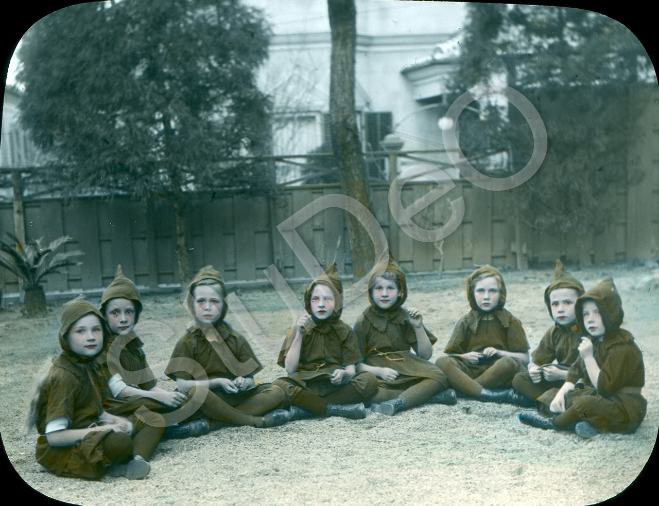 Beschreibung: Kindertheateraufführung in Kobe. Hinten das vom Architekten Riemhaus 1906 erbaute und 1907 von Familie Koops erworbenen Haus. 3. v.li. Hilde Koops.