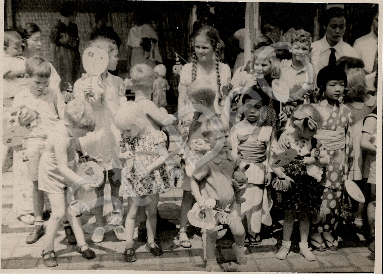 Beschreibung: Kinder spielen, japanische Kinder dabei. Manfred Müller (rechts oben mit Lockigem Haar und lachend), li. davon seine Schwerter Eva Müller (mit Zöpfen), Klus Müller ganz vorne li. seinen Fächer anguckend.