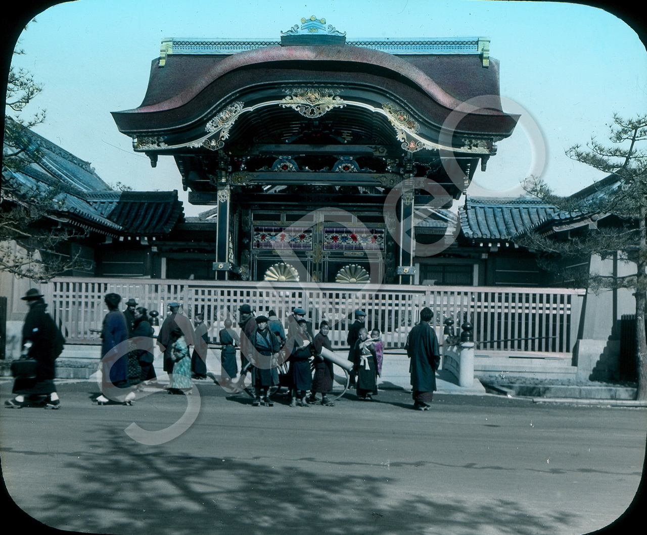 Beschreibung: Eingang –vermutlich- des Nishi-Hongwan-ji-Tempels in Kyoto (Kioto), „der berühmt ist für seine ungeheure Weitläufigkeit, kostbare Bemalung seiner Schiebetüren, herrlichen Kassettendecken u. geschnitzten Paneele“ (Marie Balser, Östliches und westliches Gelände, Longtai Verlag 2007).