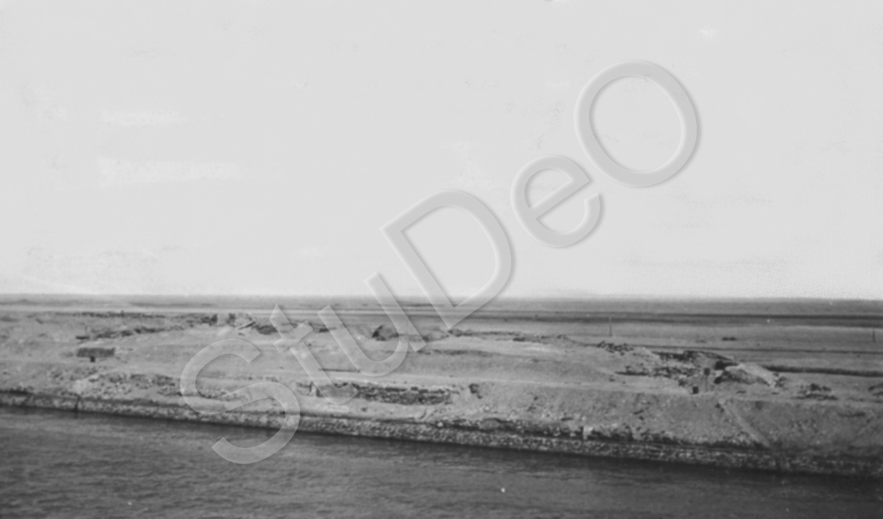 Beschreibung: Repatriierung kriegsgefangener deutscher Soldaten aus Japan. Durchfahrt durch den Suez Kanal. Schützengräben an der Küste.