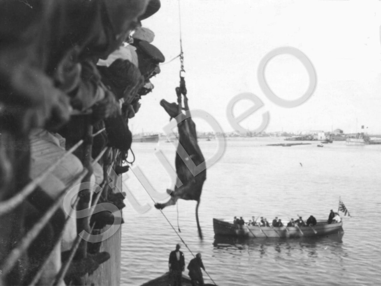 Beschreibung: Repatriierung kriegsgefangener deutscher Soldaten aus Japan. In Port Said wird eine lebende Kuh mit dem Kran auf das Schiff gezogen.