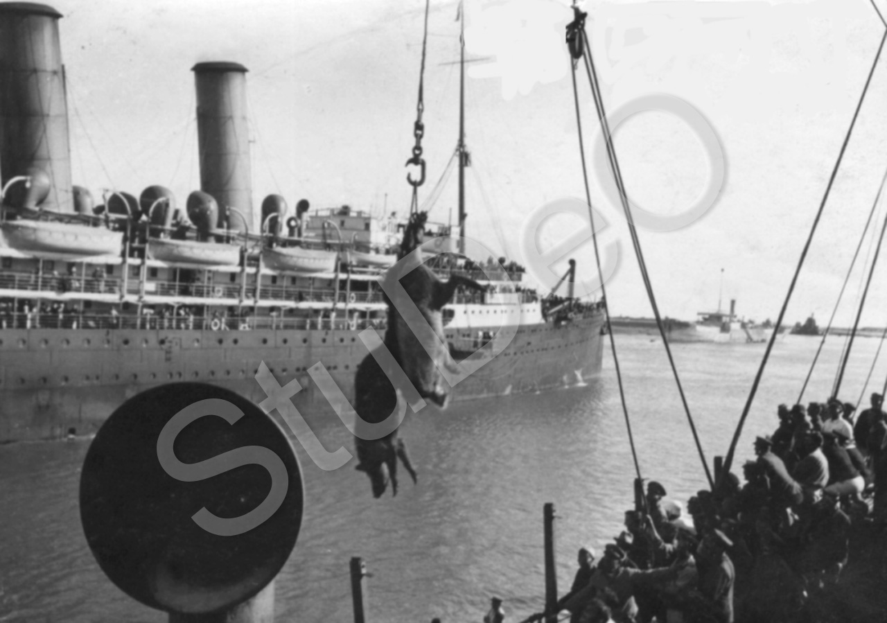 Beschreibung: Repatriierung kriegsgefangener deutscher Soldaten aus Japan. In Port Said wird zwei lebende Schweine mit dem Kran auf das Schiff gezogen.