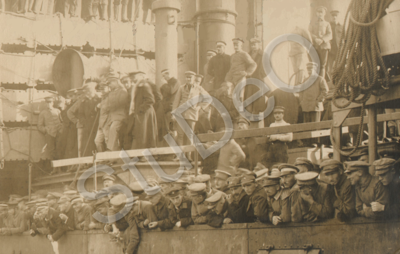 Beschreibung: Repatriierung kriegsgefangener deutscher Soldaten aus Japan. Ankunft mit der Hofuku Maru in Wilhelmshafen. Die Soldaten sind noch auf dem Schiff.