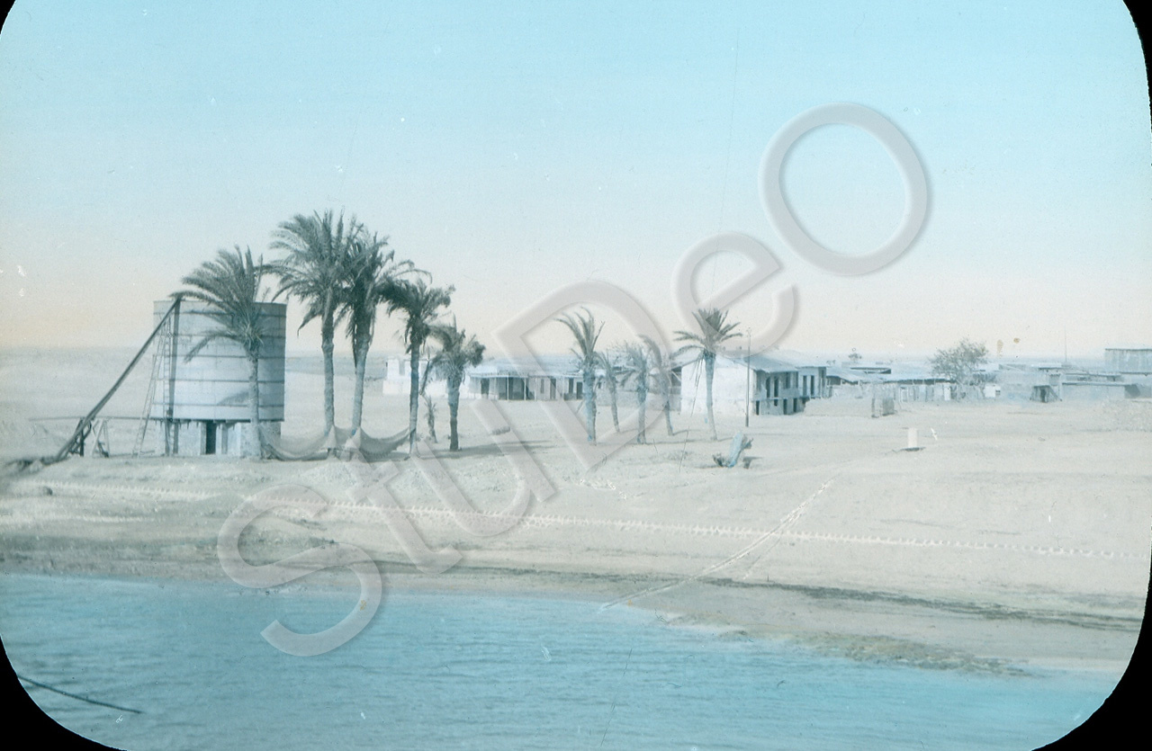 Beschreibung: Blick vom Dampfer auf ein Ufer im Suezkanal bei der Repatriierung von Erich und Erna Lenz aus Japan.