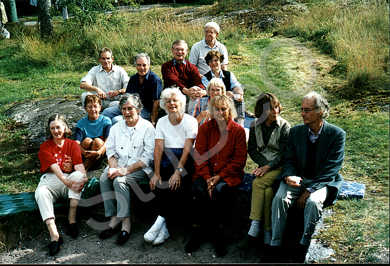 Beschreibung: Teilnehmer eines jährlichen Japan-Treffens in Schären (NO von Stock­holm) vor dem Wochenendhaus von Jörgen und Kerstin Rießen. Ehe­mals aus NI und Kobe: Dr. Eike Tillner, Dorle Waldkirch, geb. Eike­meyer und Dörthe Willimzik, geb. Bastian. Ehemals aus Kobe: Jörgen Rießen, Dr. Reiner Jordan, Anne Wolf, geb Schalow, Helga Esau, geb. Myn und Prof. Dr. R.W. Müller. Weitere Anwesende: Liesel Lenigke, Frau Müller, Udo Wolf, Marianne Schönfeld.