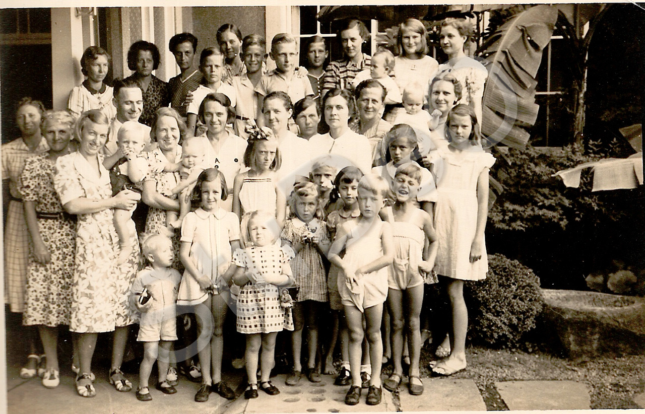 Beschreibung: Frauen und Kinder aus Niederländisch-Indien vor dem Mampei-Hotel, Atami.