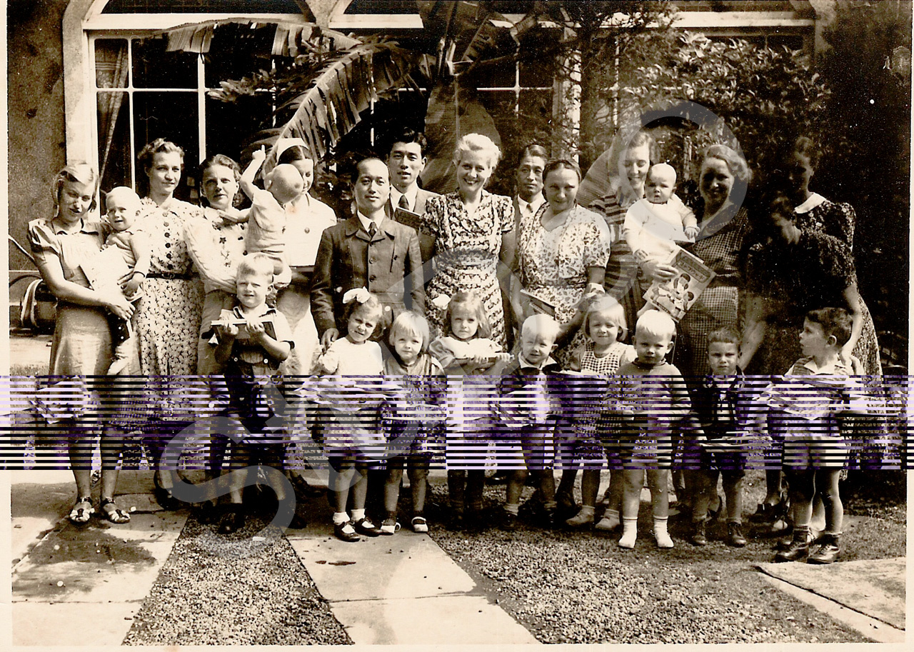 Beschreibung: Frauen und Kinder aus Niederländisch-Indien mit japanischen Beamten und in Japan ansässiger Krankenschwester vor dem Mampei-Hotel, Atami.