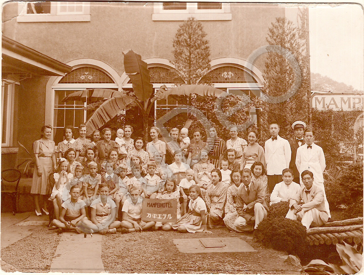 Beschreibung: Frauen und Kinder aus Niederländisch-Indien mit Japanerinnen und Japanern neben dem Eingang des Mampei-Hotels, Atami.