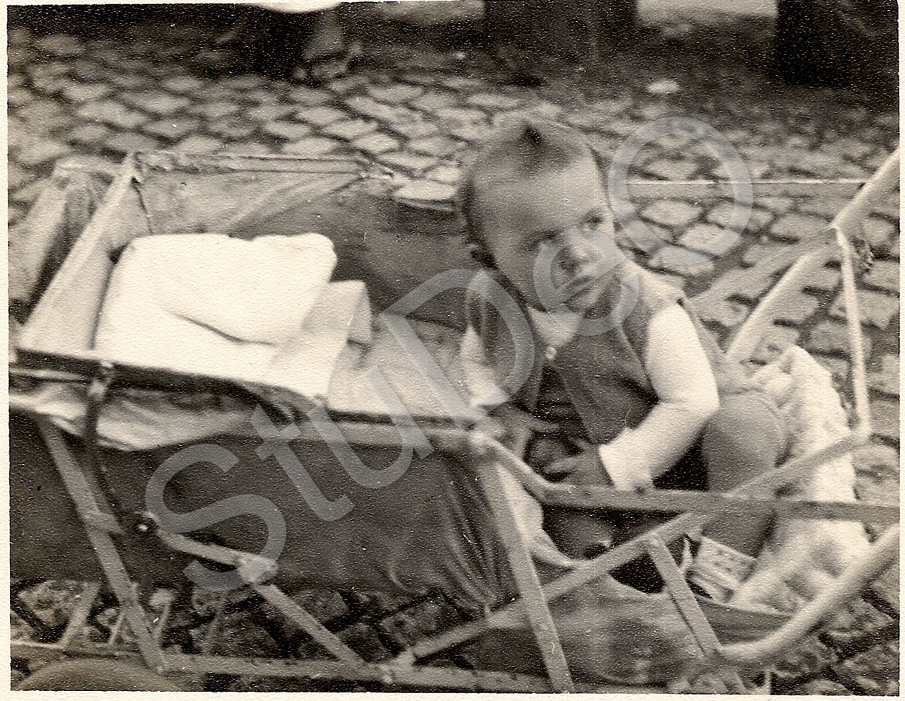 Beschreibung: Dagmar Denklau will gerade unerlaubt aus dem Kinderwagen steigen, Atami.