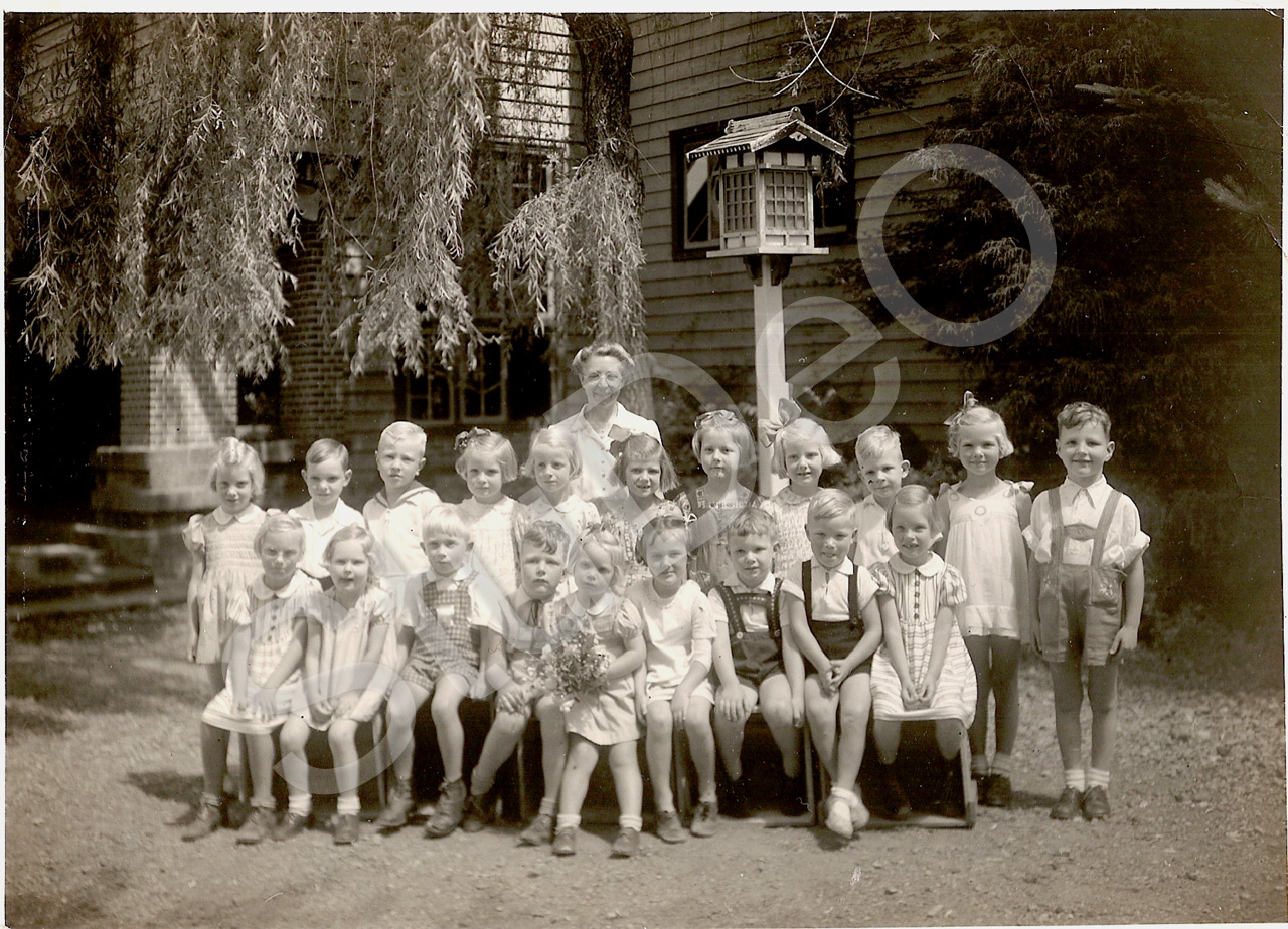 Beschreibung: Kindergarten und 1. Klasse vor dem Bekan-Hotel in Funatsu, Kawaguchi. v. vorne li. nach re. oben: Erika Fikus, Dagmar Gätke, Martin Segerling, Helmut Damschen, Gabi Freitag, Dagmar Denklau, Karli Steck, Christian Freitag, Hildegard Fikus, Ingrid Paulsen, Klaus Scheller, Albert-Otto Brücke, Dorothee Schüffner, Marianne Krajewicz, Elinor Speiser, Dorli Stabe, Gretchen Weber, Helmut Hoffmann, Sieglinde Steck, Joachim Gätke. Lehrerin Elisabeth Illerhues.