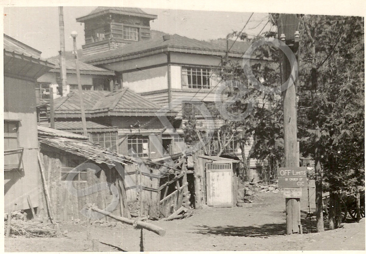 Beschreibung: Der zweite Eingang zum Hof vor dem Bekan-Hotel. Das Schild „OFF LIMITS“ (rechts im Bild) wurde vom CIC der amerikanischen Armee angebracht und war ein Hinweis für die amerikanischen Soldaten, dass sie das Grundstück nicht betreten durften.
