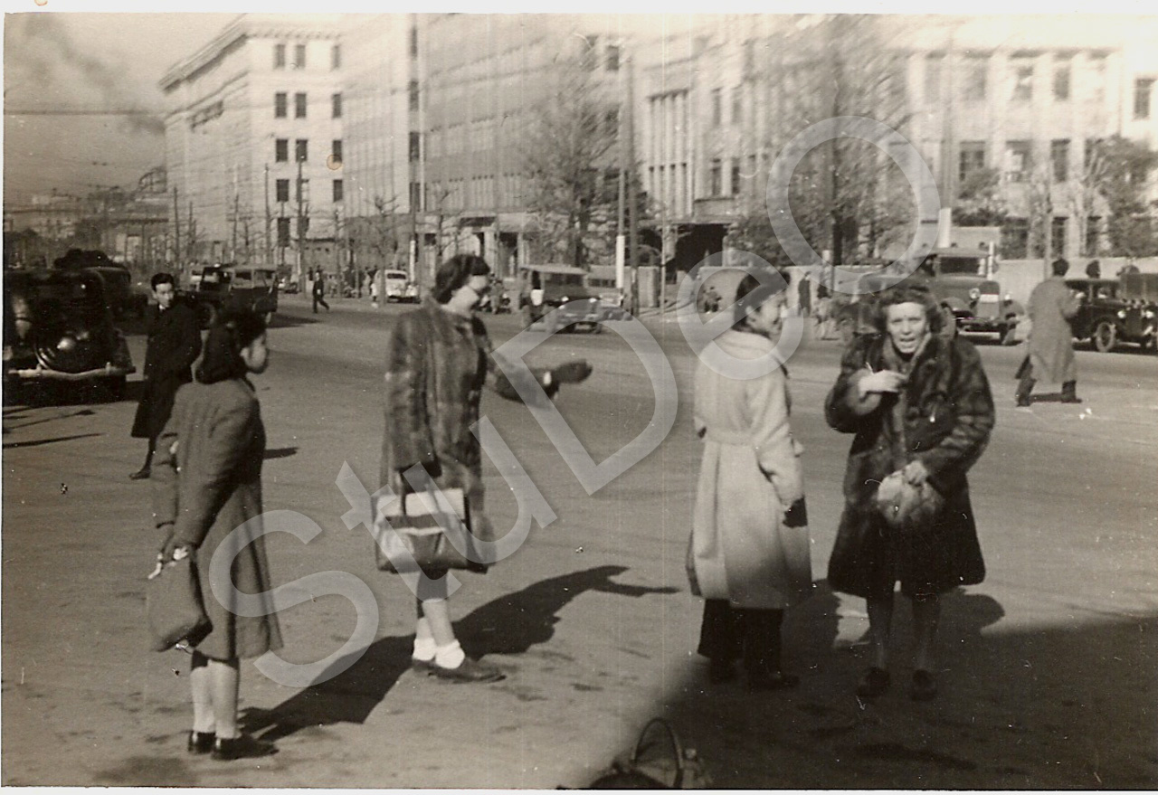 Beschreibung: Straße in Tokio, vorne von links: Japanerin, Erika Denklau, Japanerin, Hertha Köhler.