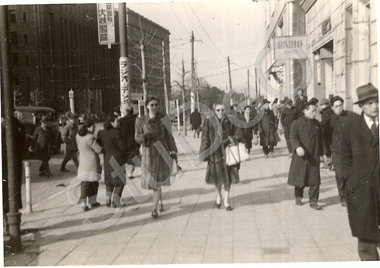 Beschreibung: vorne, Mitte, v.li.: Erika Denklau und Hertha Köhler zwischen Japanern auf einer Straße in Tokio.