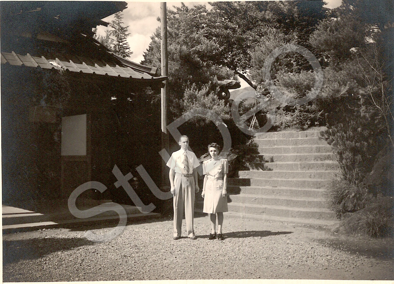 Beschreibung: Rudi und Hertha Köhler im Garten des Funatsu-Hotels am Kawaguchi-See. Links ist der Hoteleingang, die Treppe rechts führte zu den Wohnräumen der Familie Köhler. Herr Köhler hatte einen technischen Beruf und war in Japan tätig. Wegen der Bombenangriffe auf die Städte war die Familie nach Funatsu gezogen.
