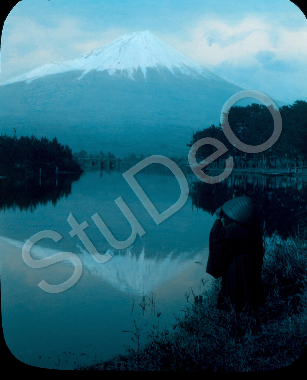 Beschreibung: Fuji spiegelt sich in einem der um ihn liegenden Seen.