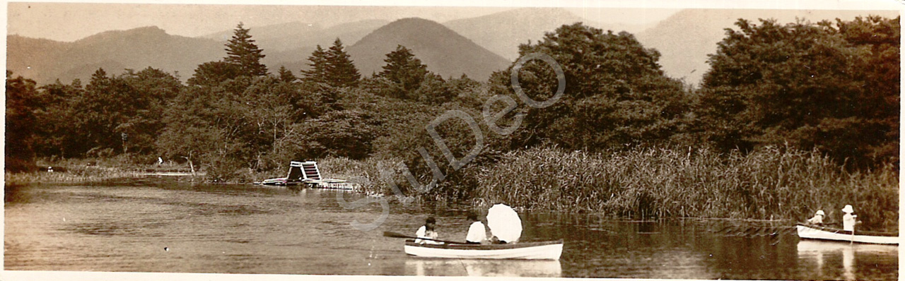 Beschreibung: Gewässer mit zwei Booten, im Hintergrund Bäume und Berge.