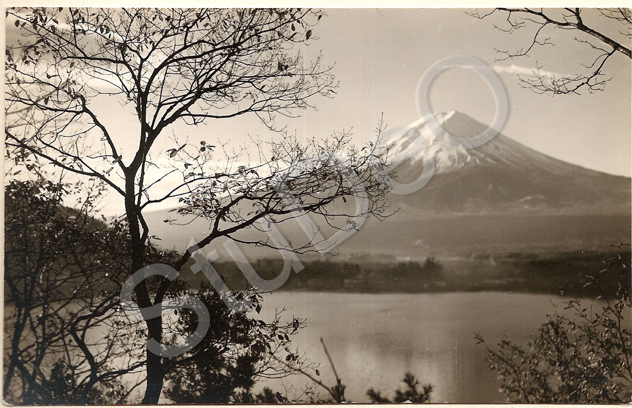 Beschreibung: Hinter Bäumen der Kawaguchi-See mit schneebedecktem Fujiyama.