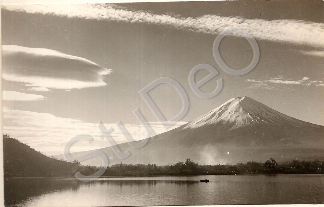 Beschreibung: Kawaguchi-See mit Fischerboot, dahinter schneebedeckter Fujiyama.