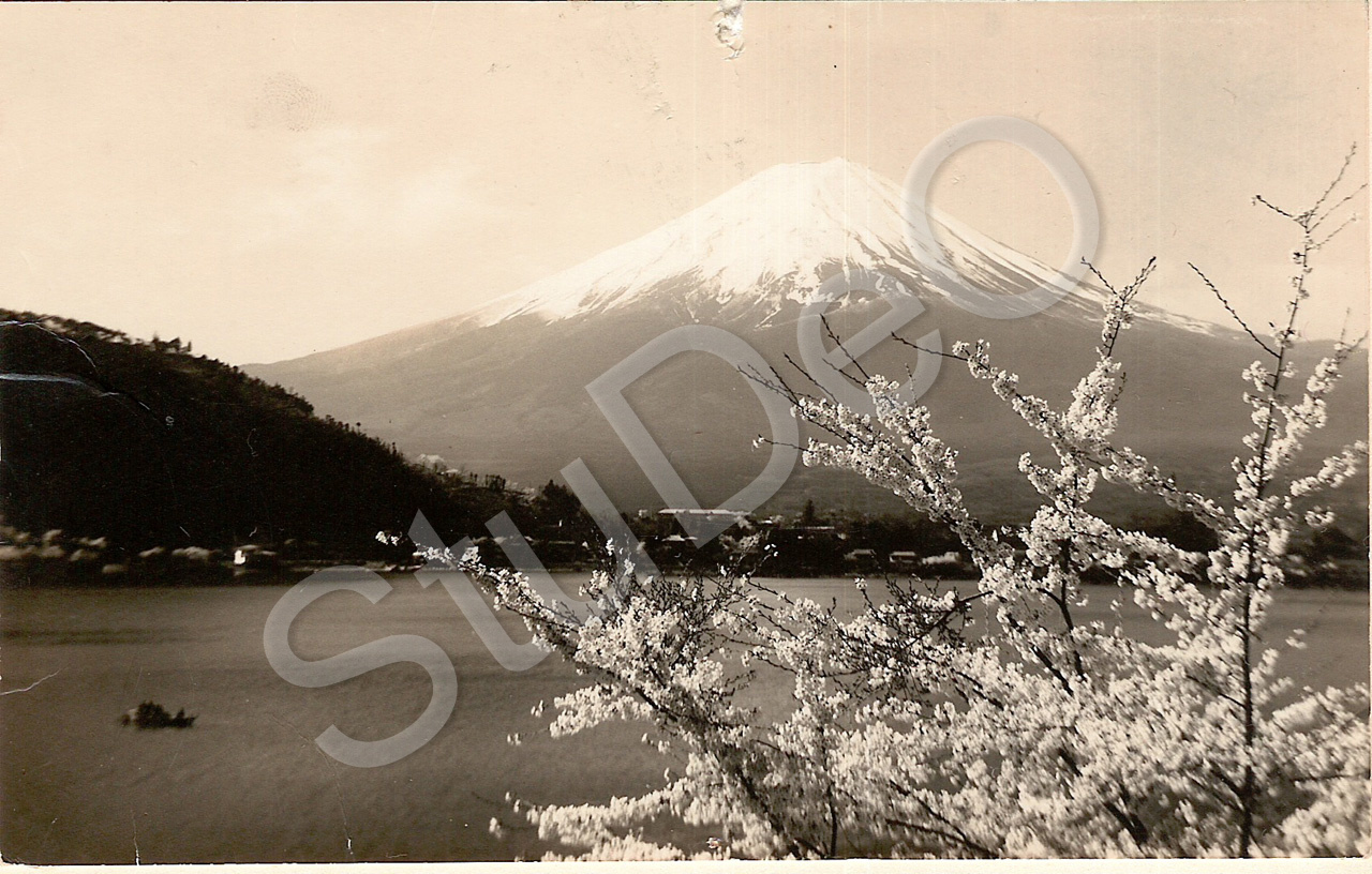 Beschreibung: Hinter blühendem Baum der Kawaguchi-See mit schneebedecktem Fuji.