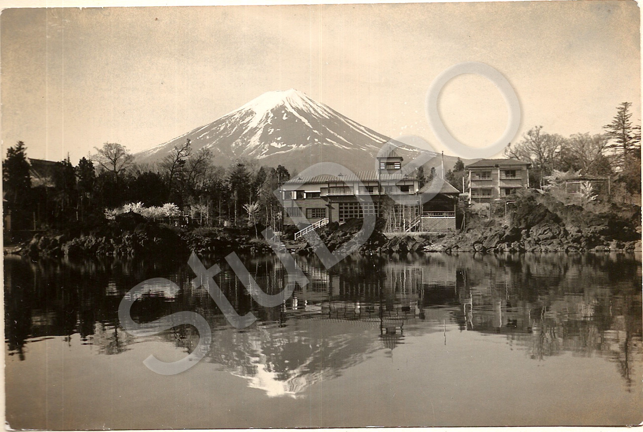 Beschreibung: Bekan-Hotel in Funatsu, am Kawaguchi-See. Im Hintergrund der Fuji. Hier wurden Frauen und Kindern aus Niederländisch-Indien von 1944 bis 1947 untergebracht. Der Schulunterricht fand in einem großen Saal des Hotels statt.