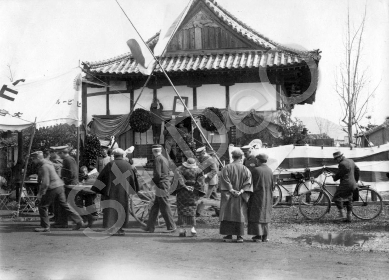 Beschreibung: Dt. Gefangene transportieren Ausstellungsobjekte in ein Ausstellungs­haus im Kriegsgefangenen­lager Marugame.