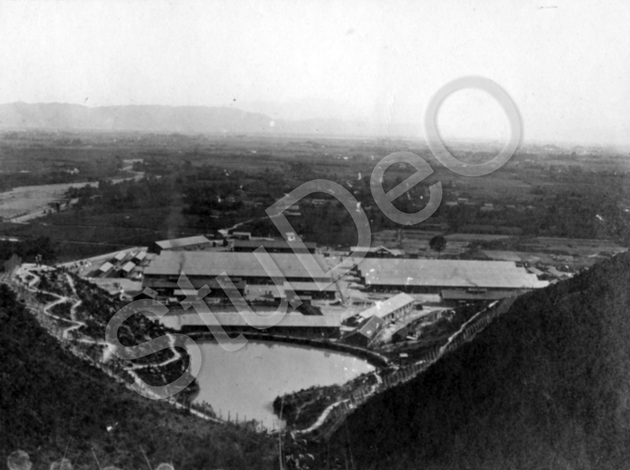 Beschreibung: Übersicht des Kriegsgefangenen­lagers Bando vom Berg aus gesehen. Baracken, See, Bergwege.