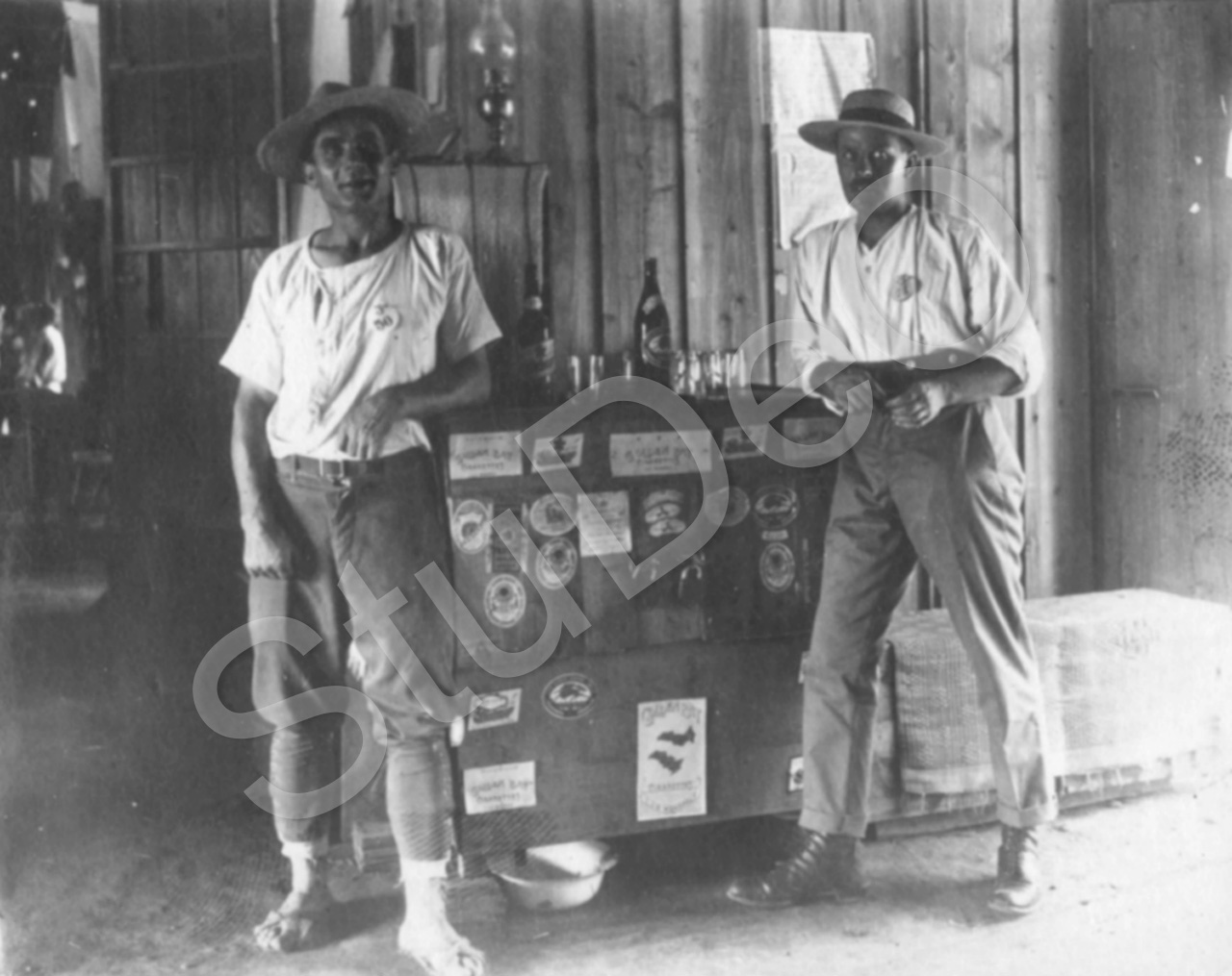 Beschreibung: Böhnke und Land an einer selbsgebasteleten „American Bar“. Kriegs­gefangenen­lager Bando.