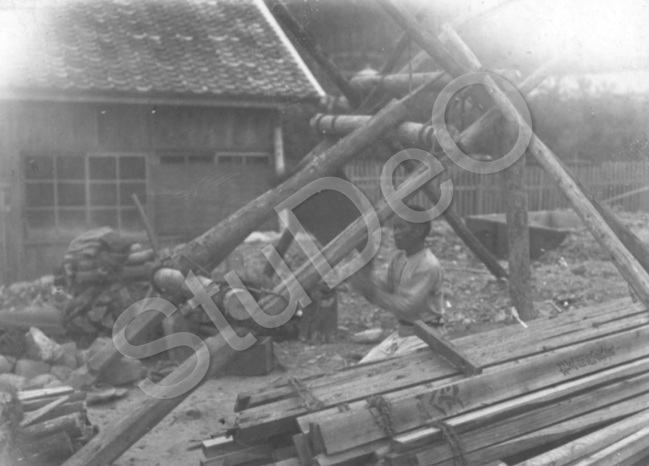 Beschreibung: Ein Japaner baut eine Holzbaracke als Snitätshaus. Kriegsgefangenen­lager Bando.