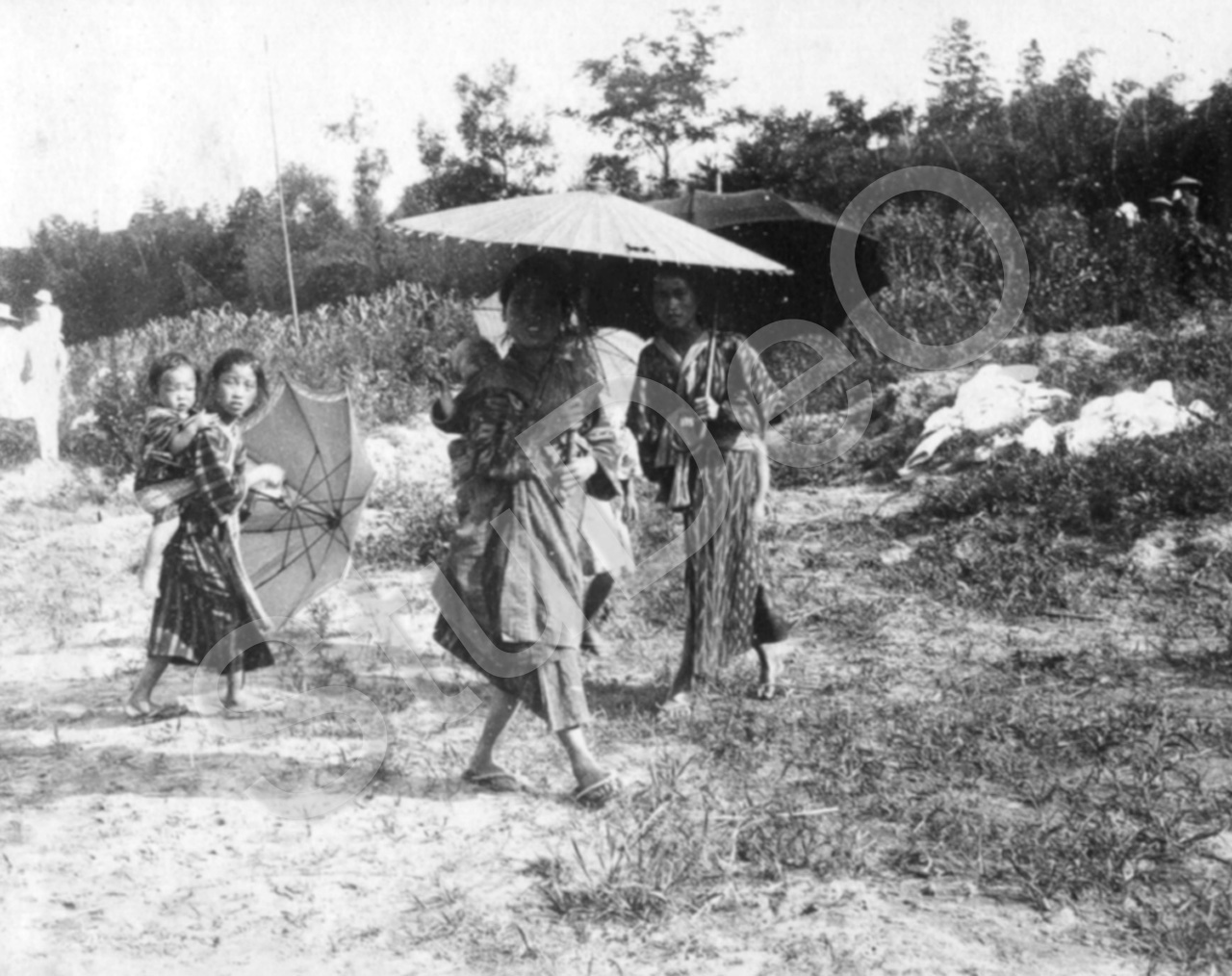 Beschreibung: Japanerinnen mit Sonnenschirm auf dem Land. Aufgenommen während der Kriegs­gefangenschaft in Bando.