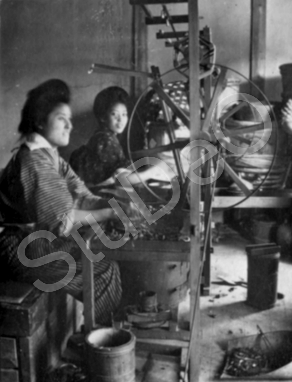Beschreibung: Tag des gemeinsamen Knabengeburtstags mit Stoffischen, die von Fauen aus buntem Stoff genäht werden  Aufgenommen während der Kriegsgefan­gen­schaft in Bando.