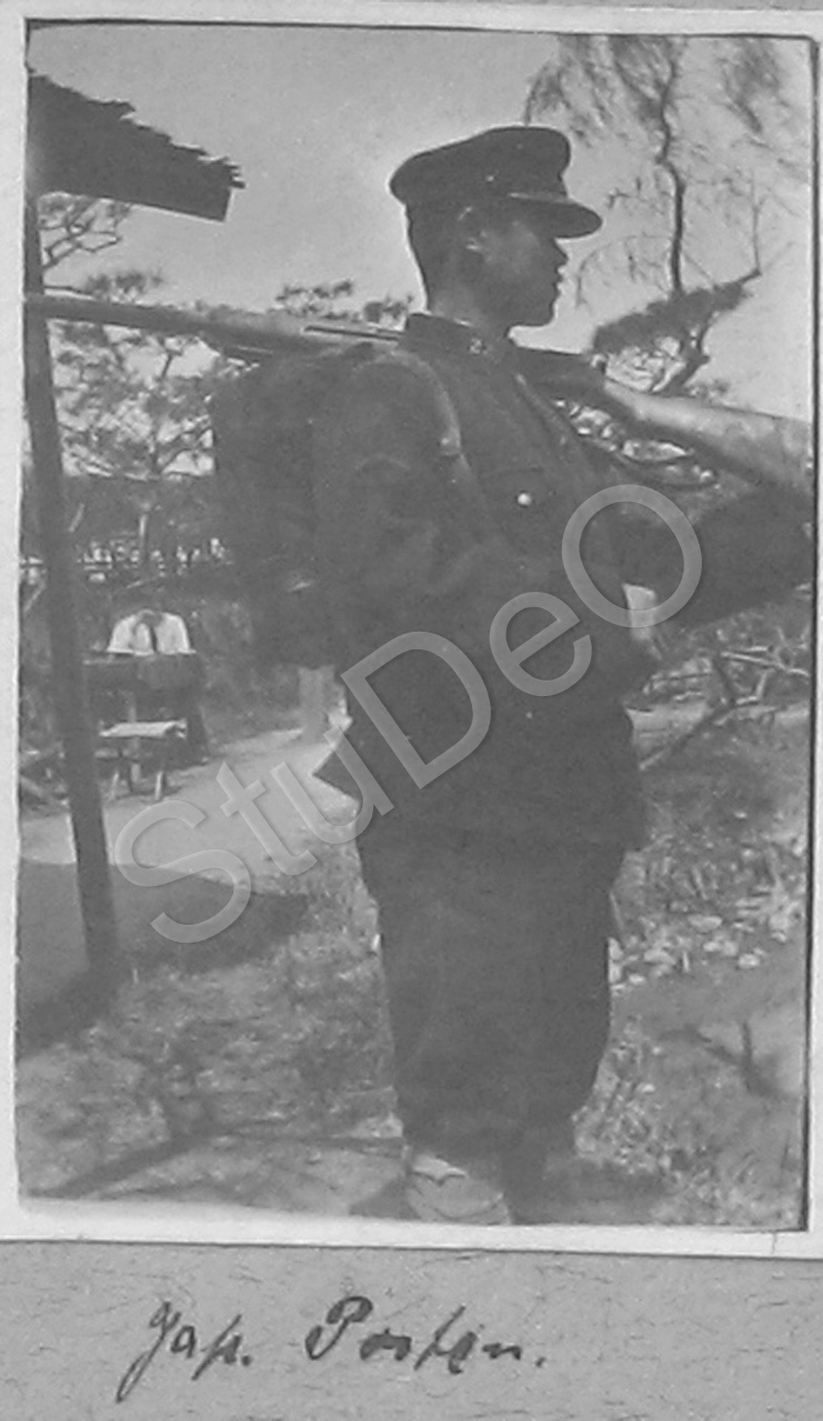 Beschreibung: Japanische Wache mit Gewehr geschultert und Rucksack im Kriegsgefan­genenlager in Bando.