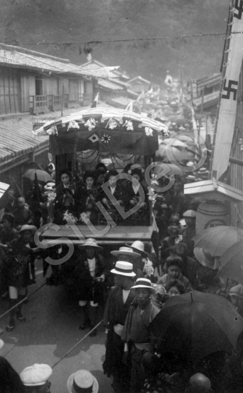 Beschreibung: Geishas fahren in einer Kutsche durch eine mit Zuschauern umsäumte, enge Straße, am Tag der Geishas. Aufgenommen während der Kriegs­gefangenschaft in Bando.