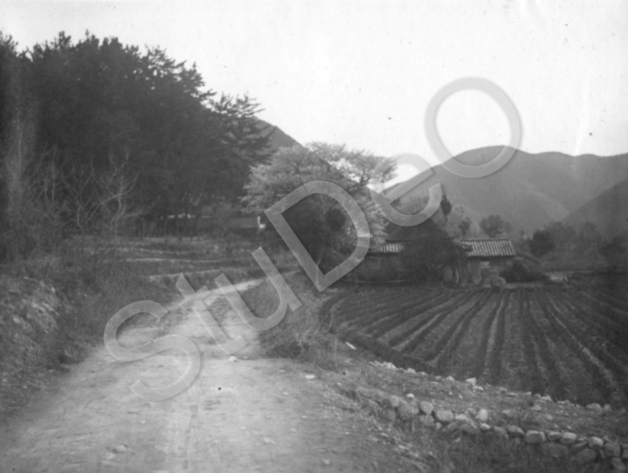 Beschreibung: Holzhackerweg in den Bergen bei Baumblüte. Felder. Aufgenommen während der Kriegsgefangenschaft in Bando.