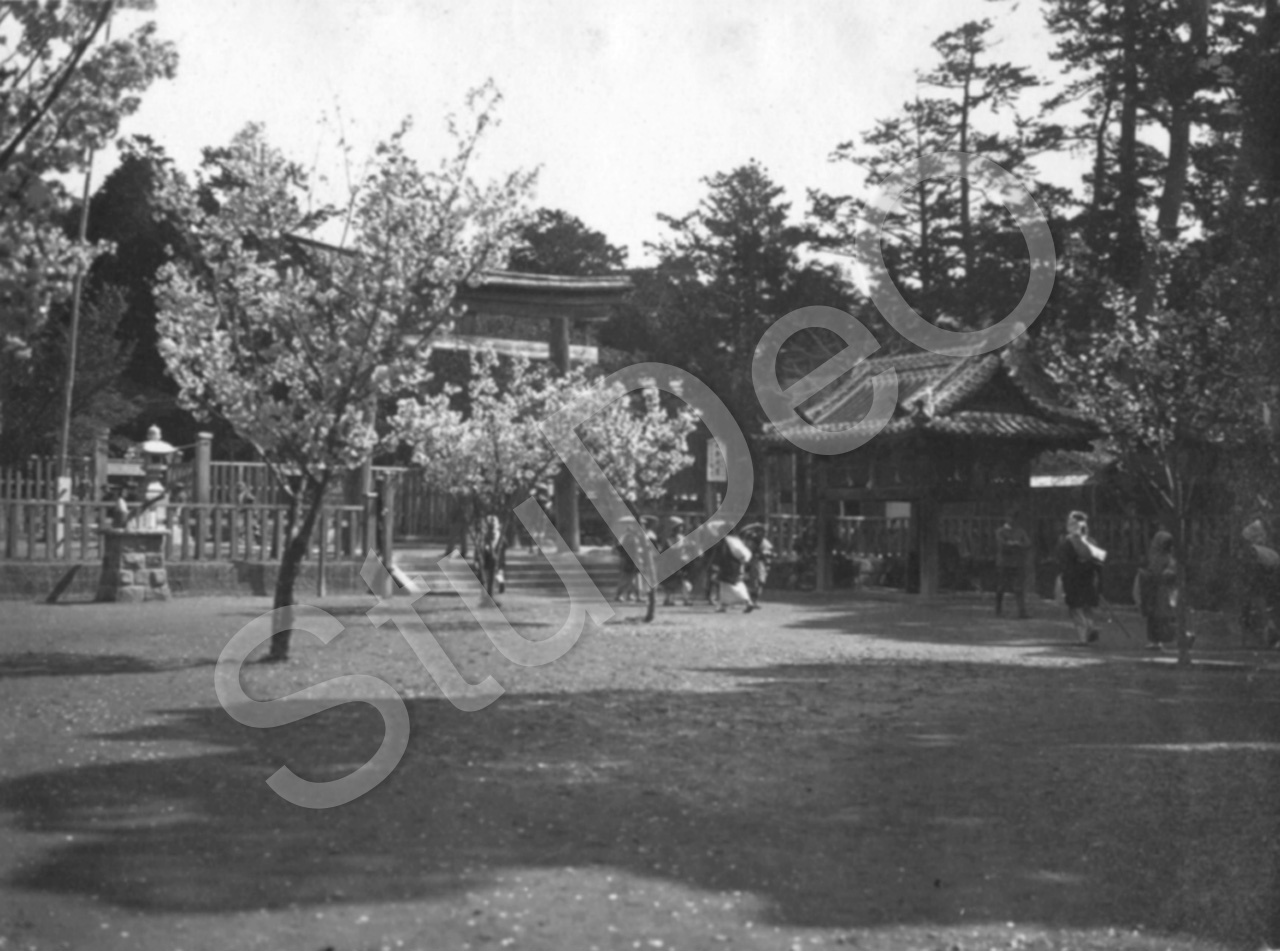 Beschreibung: Pilger gehen zum Oasa Tempel. Aufgenommen während der Kriegs­gefangenschaft in Bando Baumblüte.