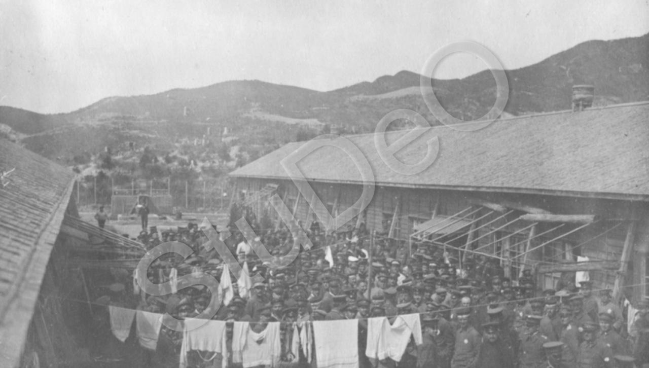 Beschreibung: Dt. Gefangene im Kriegs­gefangenenlager Bando sind zwischen Baracken versammelt um die Nachricht der Offensive im Westen zu empfangen.