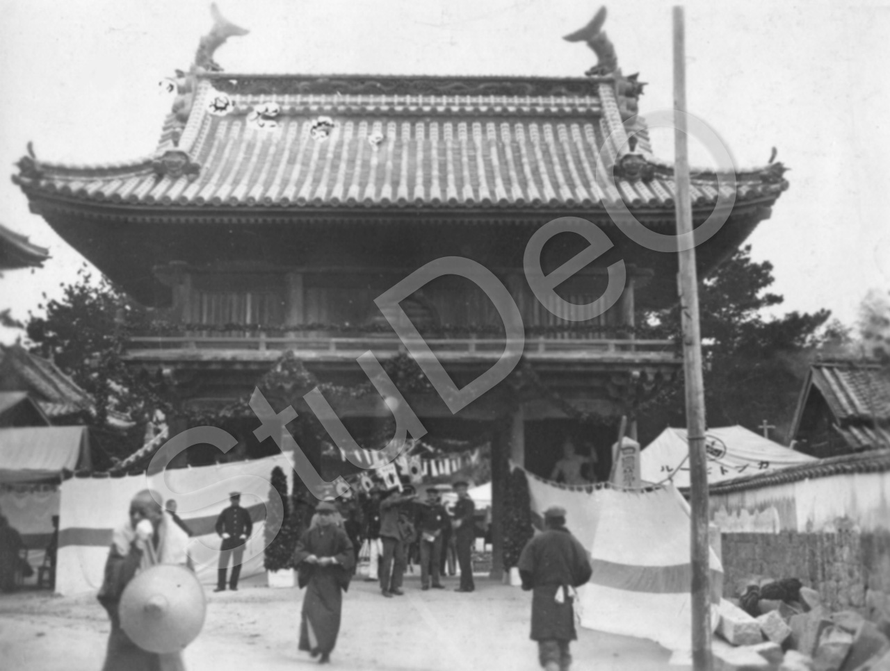 Beschreibung: Tor des Reisanji Tempels als Eingang zum Vergnügungsparks Welt­ausstellung Bando im Kriegsgefan­genenlager Bando.