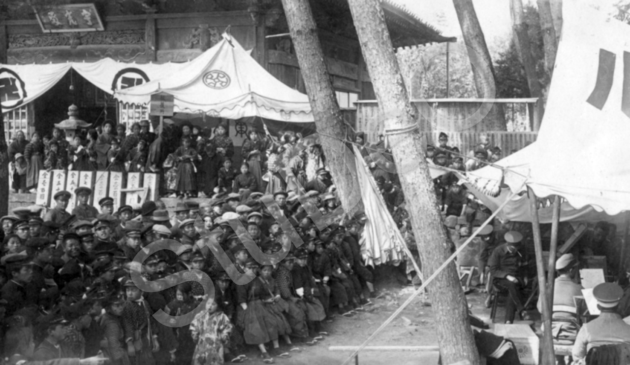 Beschreibung: Welt­ausstellung Bando im Kriegsgefan­genen­lager Bando. Japanische Schulkinder hören der Musikkapelle der Dt. Gefangenen zu.