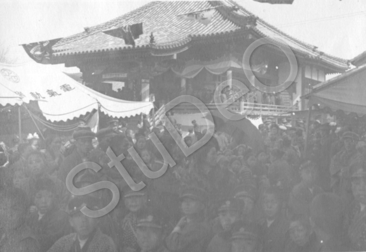 Beschreibung: Japanische Schulkinder besuchen die Welt­ausstellung Bando im Kriegsgefan­genenlager Bando an einem Regentag.