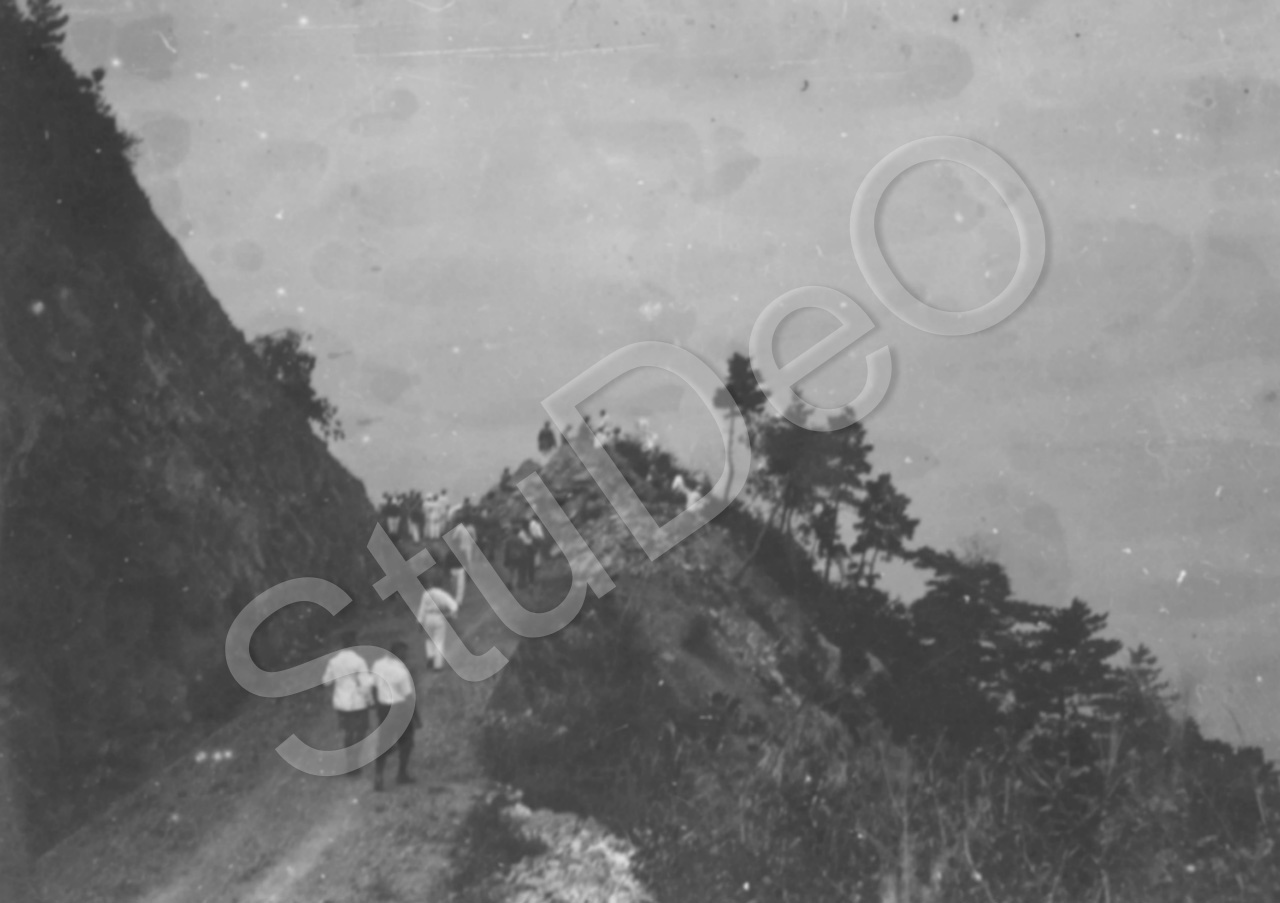Beschreibung: Dt. Gefangenen vom Kriegs­gefange­nen­lager Bando machen einen Ausflug im Osakaberg. Unten rechts ist das Meer im Nebel.