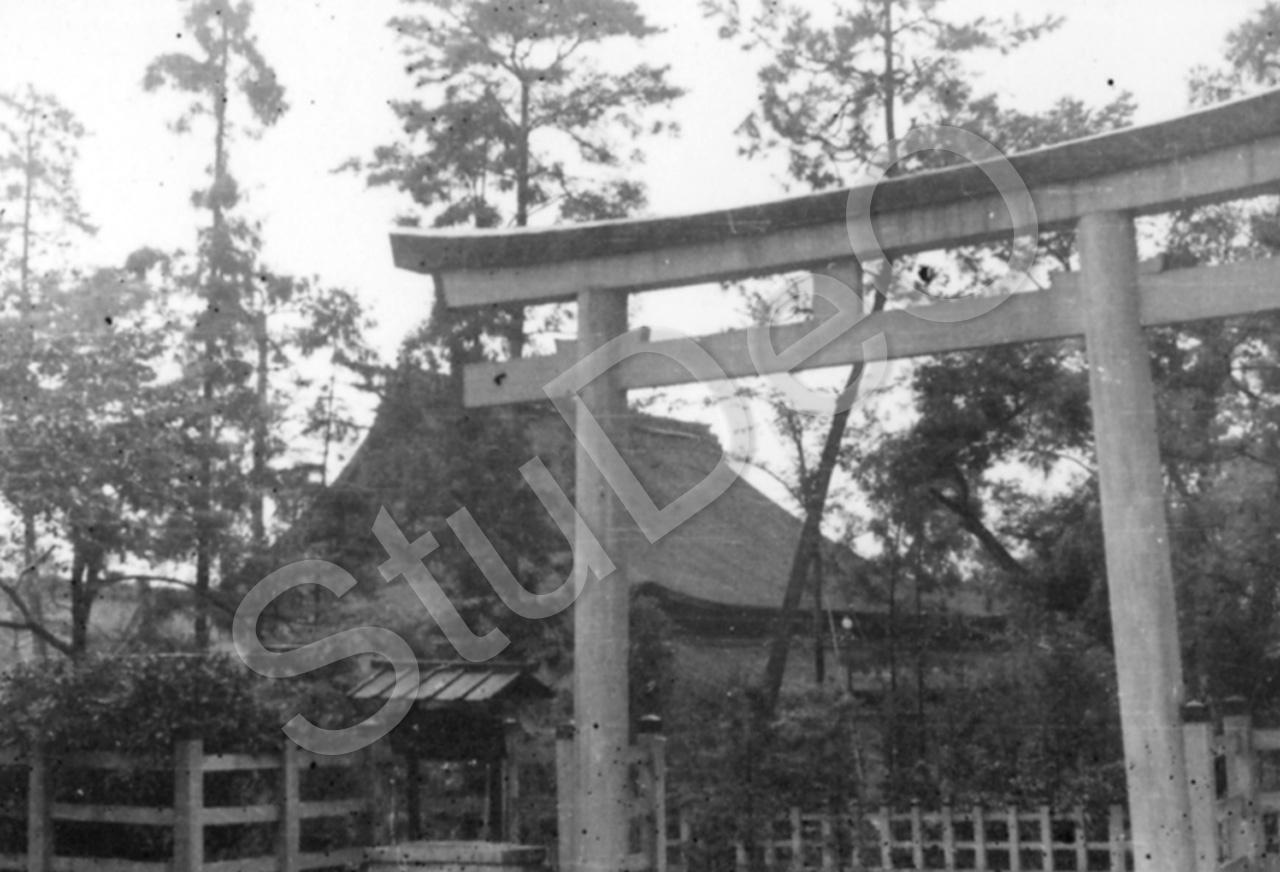 Beschreibung: Jap. Pailu (Torbogen), Torii und Tempel bzw. Schrein in einem Park.