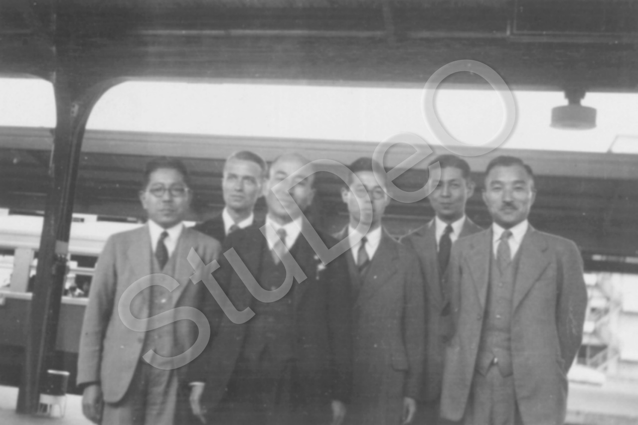 Beschreibung: Otto Günther mit Japanern auf dem Bahnsteig  bei der Abfahrt von Nagoya.