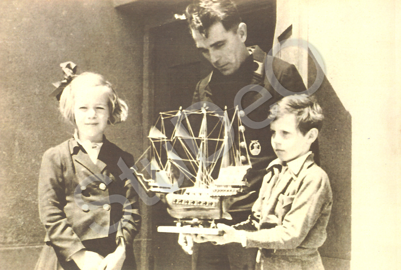 Beschreibung: Ein deutscher Matrose überreicht ein Schiffsmodell an Helga Mayn (Mutter ist Lehrerin Liselene Mayn) und Jörg Riessen, Schüler der Dt Schule Kobe.