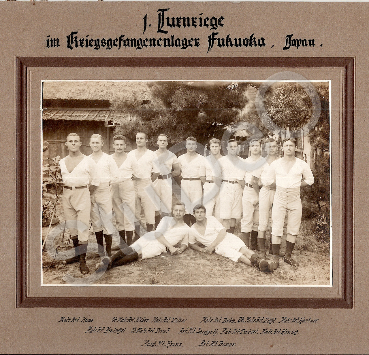 Beschreibung: „1.Tournriege im Kriegsgefangenenlager Fukuoka, Japan“ Im Bild, v.li. Matr.Art. Kuss, Matr.Art. Hentschel, Ob. Matr.Art. Wider, Ob. Matr.Art. Eost, Matr.Art. Walzer, Art.Mt. Langguth, Matr.Art. Erbs, Matr.Art. Taubert, Ob. Matr.Art. Diehl, Matr.Art. Hensch, Matr.Art. Kastner. Liegend li: Matr.Art. Kranz und Art.Mt. Bauer.