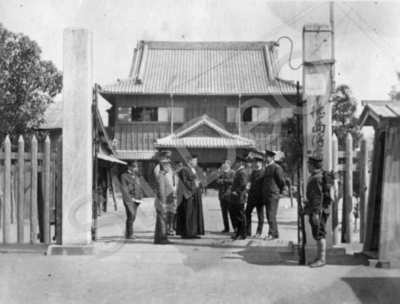 Beschreibung: Pastor Schröder mit Dt. Gefangenen am Tor des Kriegs­gefange­nen­lagers Tokushima. Japanische Waache mit Rucksack und Gewehr.