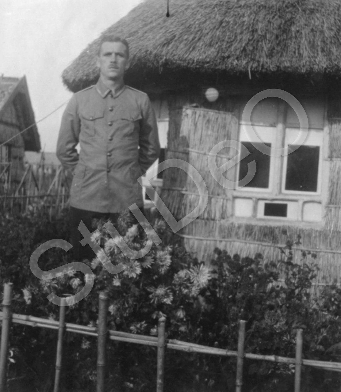 Beschreibung: Offizier E. Paul steht vor einer redbedeckte Baracke aus Stroh im Kriegs­gefange­nen­lager Narashino.