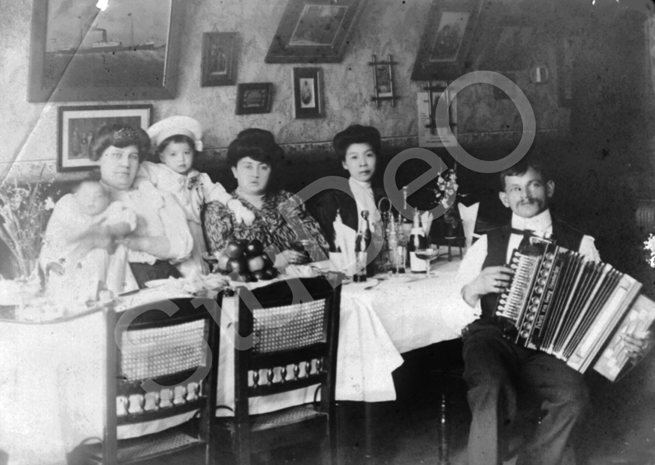 Beschreibung: Friedrich Wagenknecht spielt Akkordeon in seiner „Liberty Bar“. Rechts hinten seine japanische Frau Yasu. Yokohama.
