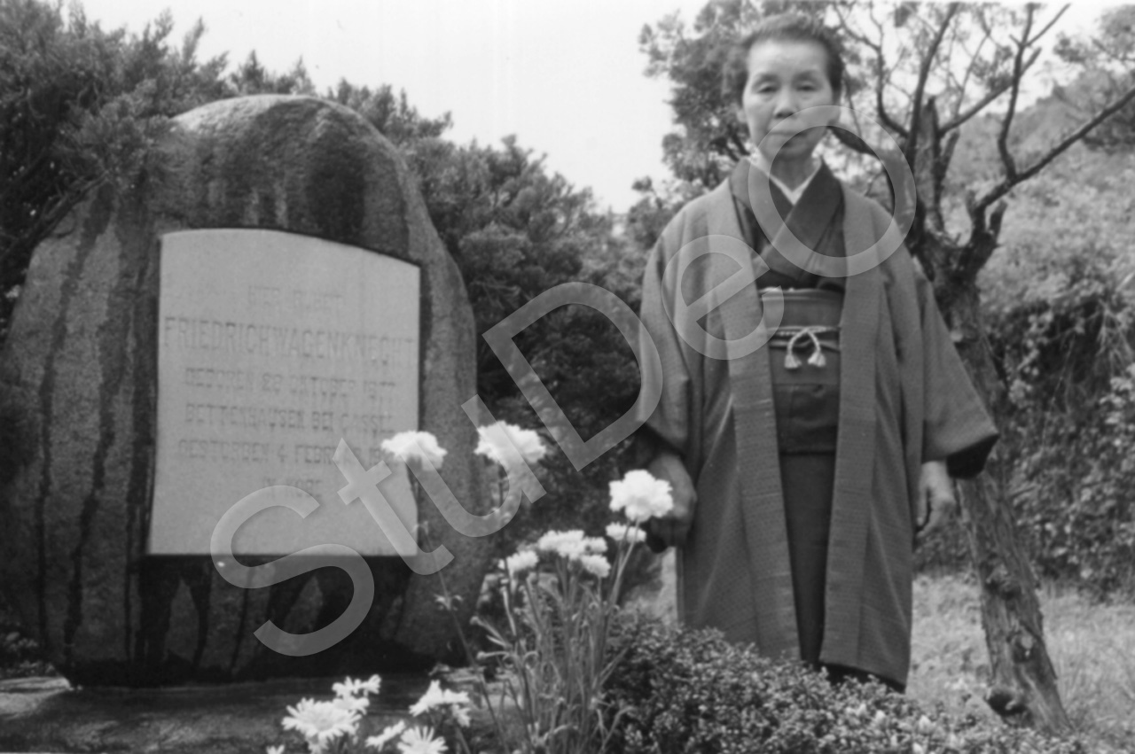 Beschreibung: Yasu Wagenknecht steht neben dem Grab ihres Mannes Friedrich. Inschr. auf dem Grabstein „Hier ruhet Friedrich Wagenknecht geboren 28. Okto­ber 1877 Bettenhausen bei Cassel, gestorben 4. Februar 1923 in Kobe“.