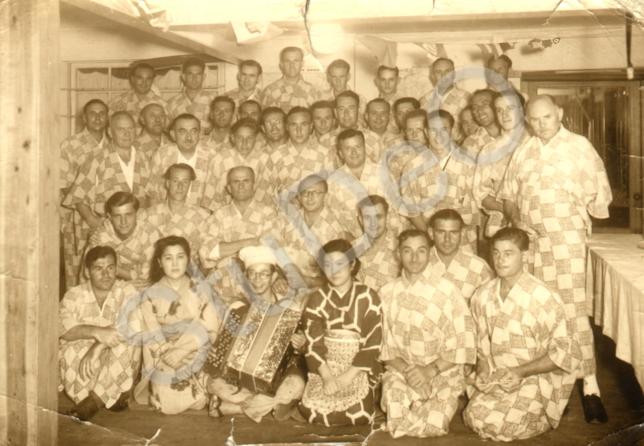 Beschreibung: Vermutlich eine Schiffsbesatzung (des Tankers „Charlotte Schliemann“?), im Hotel eines japanischen Badeorts (Onsen). Der dritte v.r. stehend ist Rudolf Bruns. Sie haben alle die gleichen Kimonos „Yukatas“ an, die in einem Onsen (bis Herbst 1944) zur Zimmerausstattung gehörten.