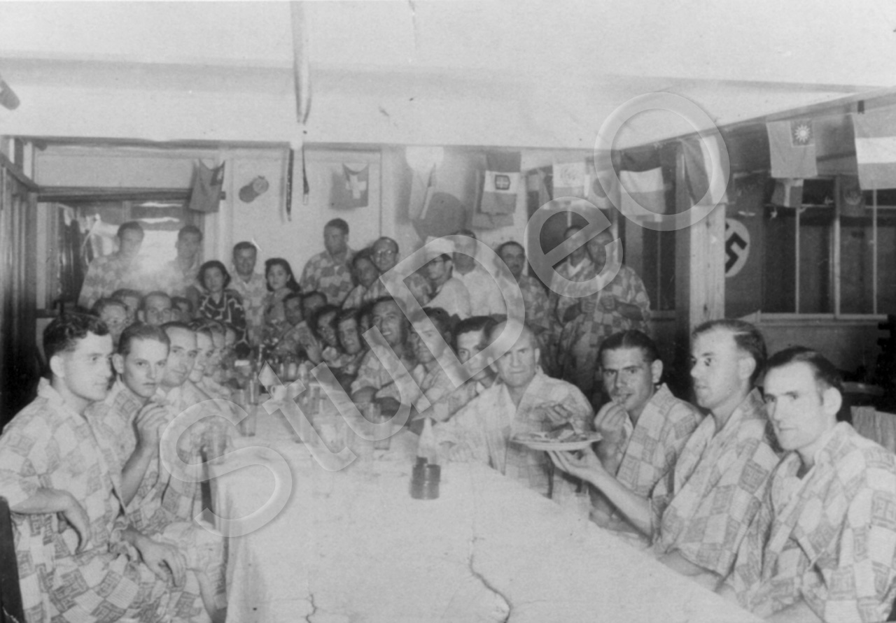 Beschreibung: Vermutlich eine Schiffsbesatzung (des Tankers „Charlotte Schliemann“?), in einem japanischen Badeort (Onsen). Der 7. v.r. sitzend ist Rudolf Bruns. Sie haben alle die gleichen Kimonos „Yukatas“ an, die in einem Onsen (bis Herbst 1944) zur Zimmerausstattung gehörten.