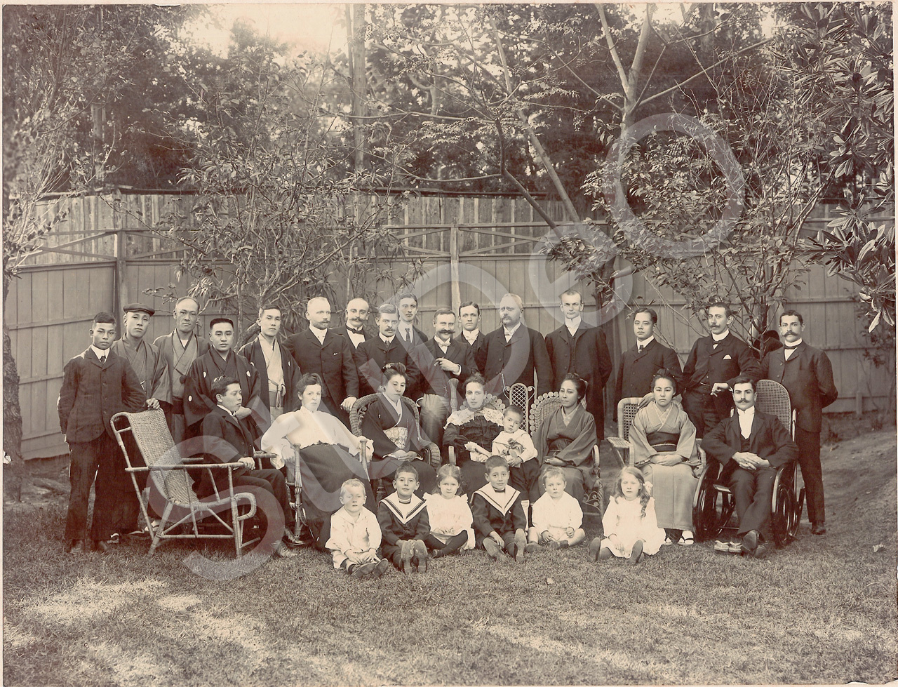 Beschreibung: Vermutlich die Übergangszeit von der Firma H. Ahrens & Co. auf Win­ckler & Co. in Yokohama. Jakob Winckler vermutlich in der Mittel mit großem Schnauzer und Zigarre. Einer wird Herr Greppi (Schweizer) sein.